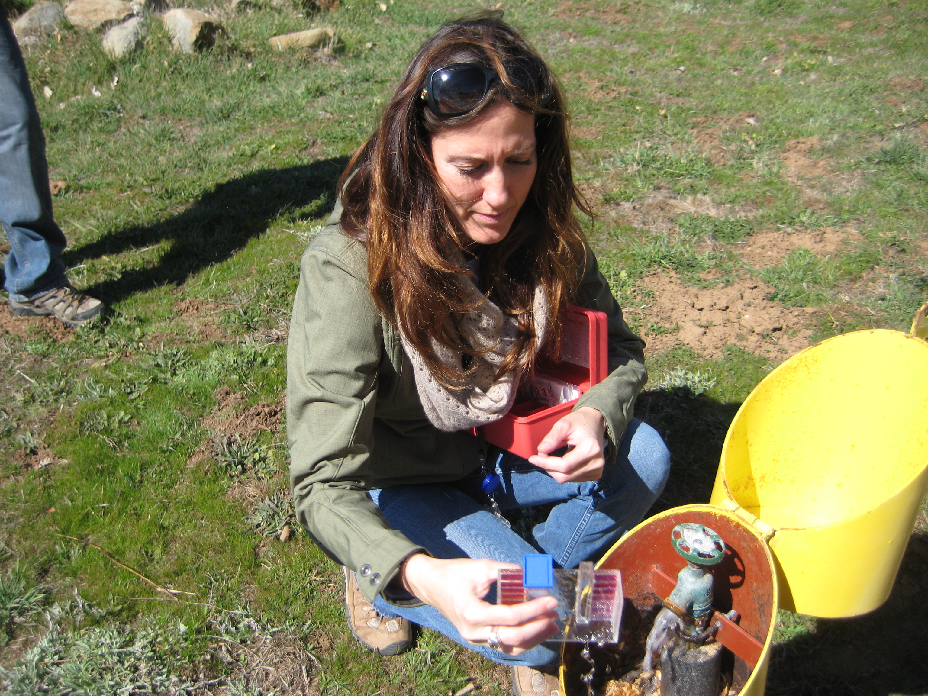 Jamelle McCullough kneels down in the mid-morning sun near Lake Cuyamaca and peers intently into the water swirling in the graduated cylinder from her water-testing kit.