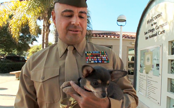 A Marine from Santee was chosen from more than 70 applicants to adopt the young Chihuahua that fell 80 feet from a cliff in Ocean Beach Jan. 11.