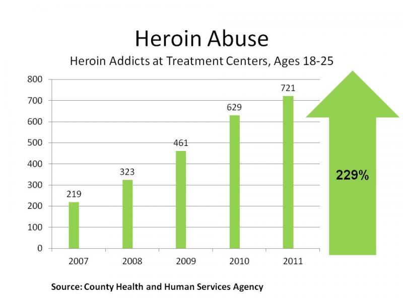 In the last five years, the number of heroin addicts at County-funded treatment centers increased by 57 percent. Heroin abuse skyrocketed especially among people between the ages of 18 and 25: a whopping 229 percent increase.