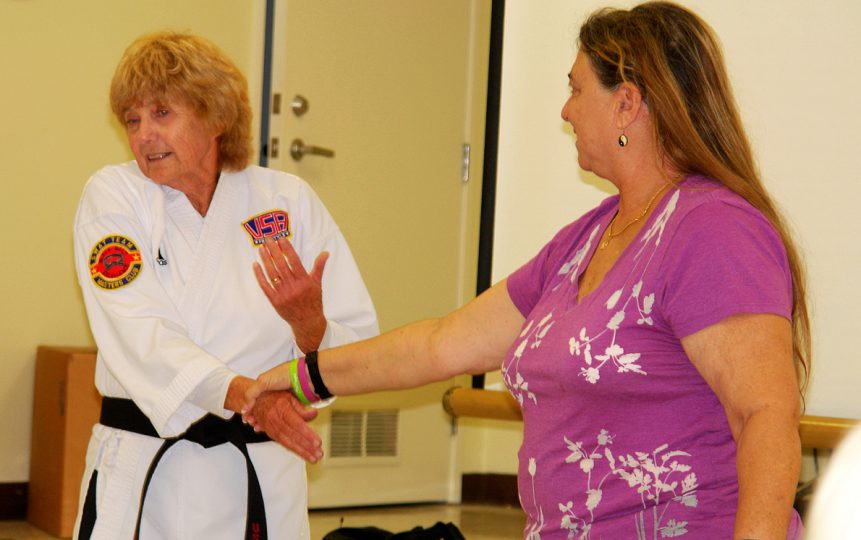 Two dozen seniors followed the lead of 72-year-old third-degree black belt karate instructor Mary Davis and put their hands up – palms out – and shouted in unison.