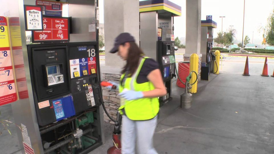 An Environmental Health Specialist makes an annual inspection to make sure a local gas station is complying with Underground Storage Tank Regulations.