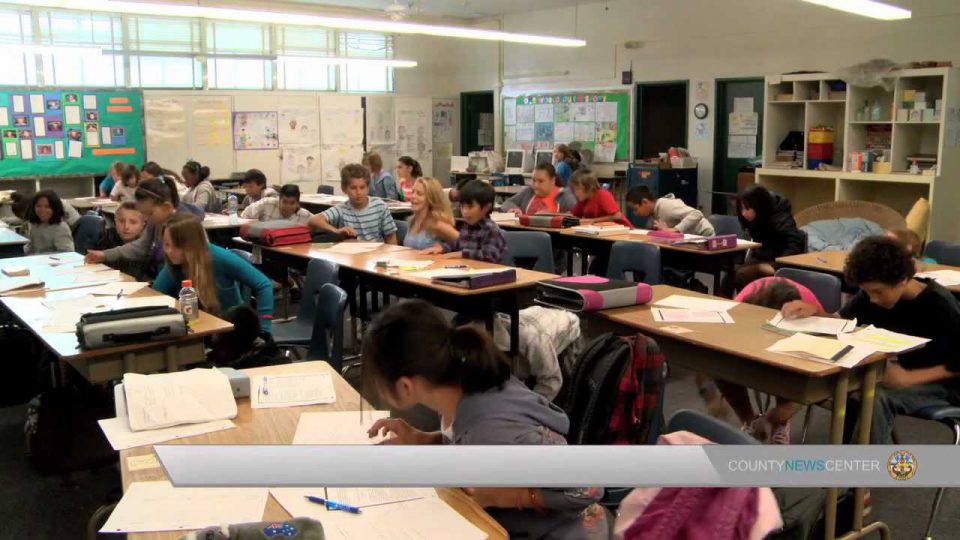 Students at Taft Middle School in Serra Mesa participate in a statewide earthquake drill and demonstrate the safest response to protect themselves from falling objects and debris.